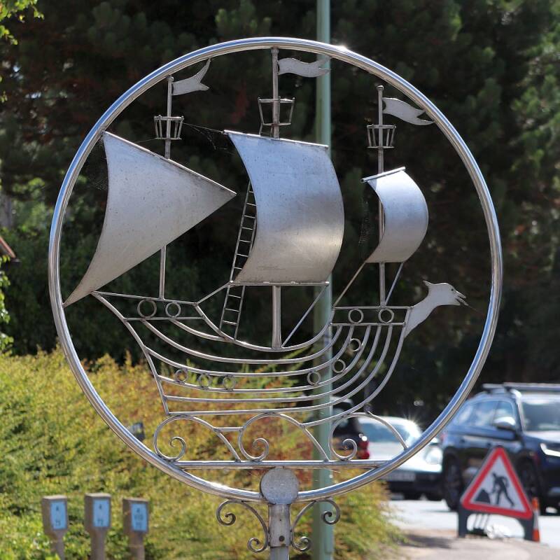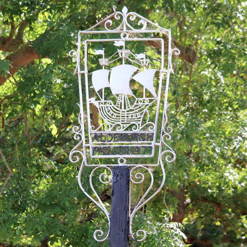 The sign was erected in 1977 to commemorate the Queen's Silver Jubilee and made of wrought iron by Charles Pegg, a local man. The original signs features a nautical theme showing a Tudor merchant ship which would have frequented the port in its time. A new sign with no name is located on the roundabout approaching the town from the west and has a similar theme. There is also a blackened version outside the library made by Suffolk Ironworks.