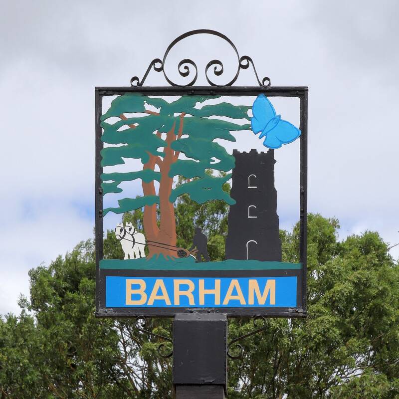 The proposal that a village sign should be made and erected at some suitable spot in the parish of Barham was agreed by the Parish Council in 1985. Following this decision, a design was worked out by the late Keith Pilling, an artist and member of the council at that time. Once the design was produced, offers of help to supply materials, welding and painting were made by local residents. The sign which we see today is therefore the work done by parishioners of Barham. It was completed in 1989 and the unveiling ceremony was performed by County Councillor Mr G H Caldwell-Smith on Saturday 7 October 1989.