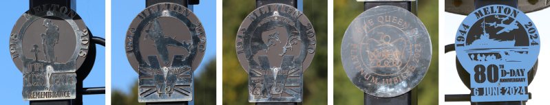 There are also several roundels displayed on the front of the post and one on the back. These plaques commemorate 100 years of the end of WWI, the 75th Anniversary of VE day (Victory in Europe) & VJ Day (Victory in Japan) and a plaque celebrating the Queen's Platinum Jubilee on the front. The one on the back celebrates the 80th D-Day anniversary on 6th June 2024.