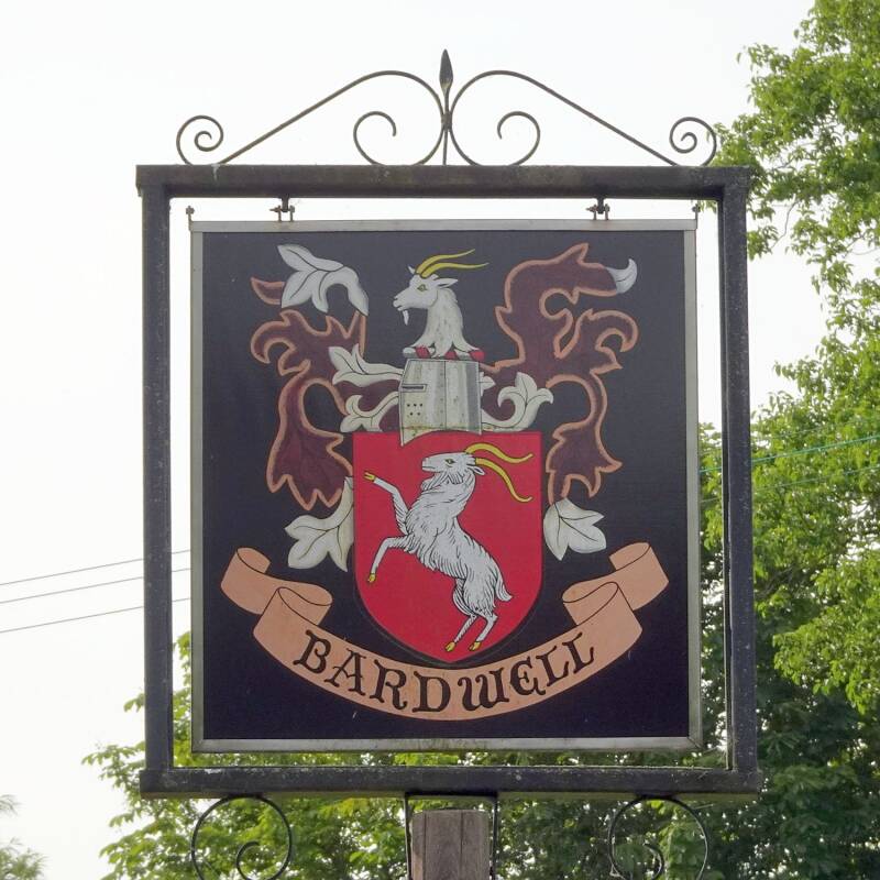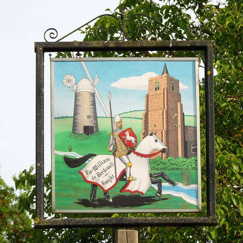 The sign has two sides with different themes, dominated by Sir William Bardwell (Berdewell). The side with the village name on shows the arms of the Berdewell family. On the reverse side the theme is dominated by Sir William de Bredewell on his horse in full armour and bearing his family shield with the leaping goat. In the background are the church of St Peter and St Paul, the Blackbourne River in the bottom left and the windmill which still stands and is now a private dwelling.