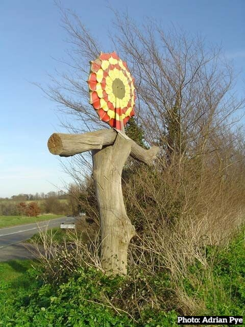 The sign is quite unique with the sun sitting on top of an oak tree with what looks like arms. It actually looks like a scarecrow. It did actually cause some grief with the locals and was vandalised when it was first erected. The village name is difficult to see as it is carved down the trunk. The intention of the sign was to represent the two solitices with the back side being mainly red on the outside. The sign was designed and made by Keith Payne and erected in 1981. The sign is located on the Beccles to Bungay Road, B1062.