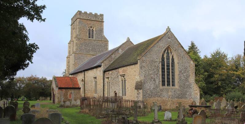 The church of St Nicholas has an external Norman doorway and some nice internal rood screen saints.