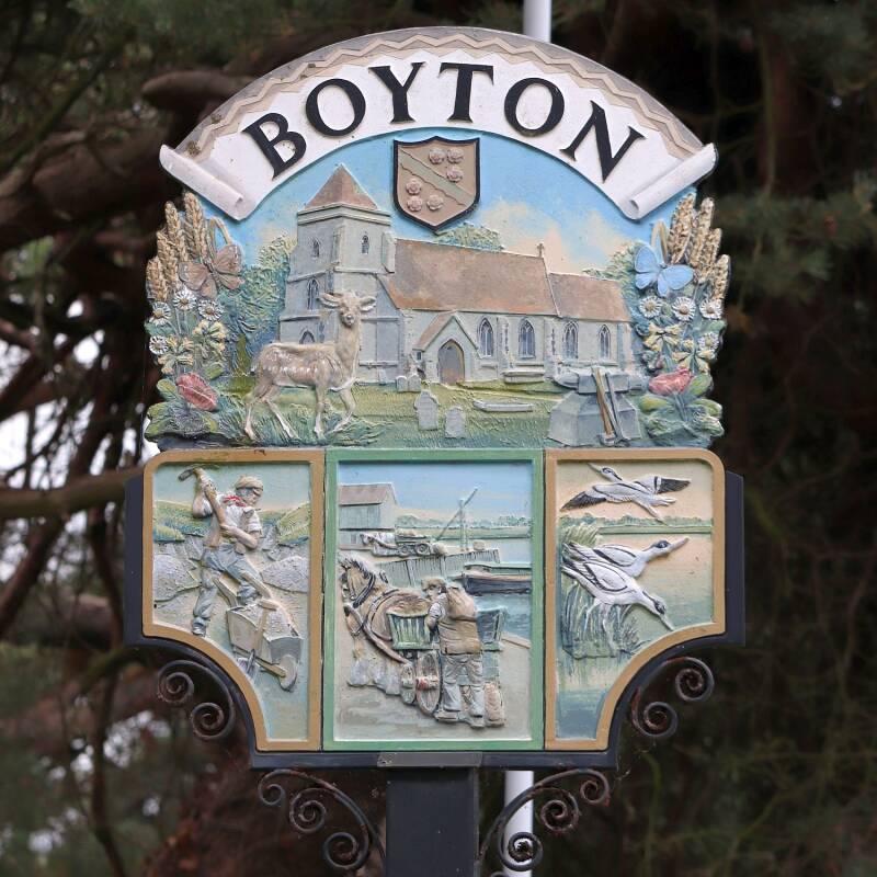 The church of St Andrew, a fallow deer, with various other flora and fauna hinting at the agricultural heritage of the parish which are accompanied by a blacksmith’s anvil and tools. Below the main illustration are three more, the first depicts a man digging a ditch, known as The Tang, allowing boats to reach the village. The second, are docks indicating the trading of commodities which went on, and the third shows avocets which are commonly seen on Boyton marshes.