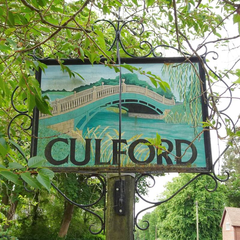 A double sided sign with Culford Hall on one side and The Iron Bridge on the other. Culford Hall was built by Sir Nicholas Bacon in 1591 and in 1660 the estate passed through marriage to the Cornwallis family. The hall which was rebuilt in 1796 for the Cornwallis family and is central to the Culford Estate. It is now The Culford School after being sold by the 7th Earl Cadogan in 1935. The Iron Bridge spans the estate’s lake, west of the hall. It was constructed in 1804, designed by Samuel Wyatt and is and is made of five tubular cast-iron sections repeated six times form the 60ft span, supported on channelled granite abutments. It is the largest of the eight surviving cast iron bridges built between 1790 - 1810. The sign was given to the village in 1977 by Culford & West Stow Women's Institute and was refurbished in 1994 to commemorate the centenary of Parish Councils.