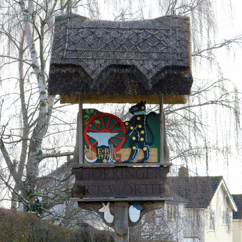The sign was erected in 1977 to celebrate the Queen's Silver Jubilee, with a design by Paul Woricker, D. Chaplin and L. Avis. The sign is topped with a protective thatched canopy. The spotted panther (ounce) represents the Hervey family (Marquess of Bristol) seen next to a bundle of past industrial implements including the blacksmiths anvil and tools as well as a cartwheel and tools, rake and hand scythe. There are also oak twigs in the background representing the Tea Party Oak in Ickworth Park. Not sure if that is an artist's palette in the background behind the tools. In the spandrels under the name is a deer and sheep also from the park and medieval wool industry.