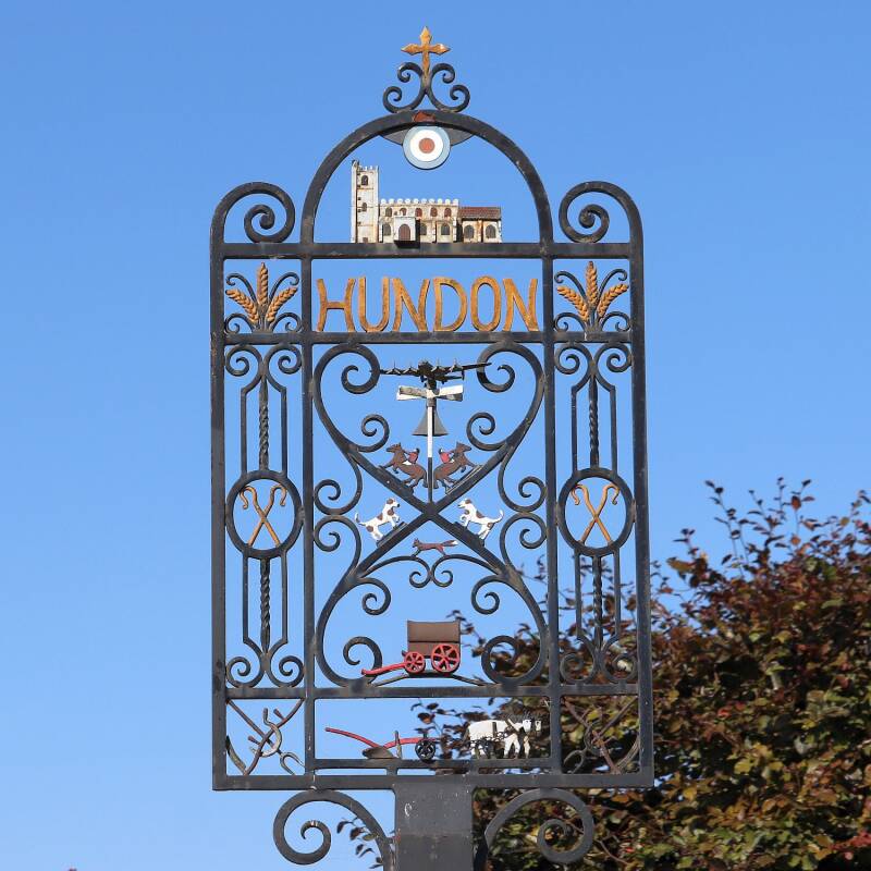 Hundon All Saints and the memorial at the base of the village sign