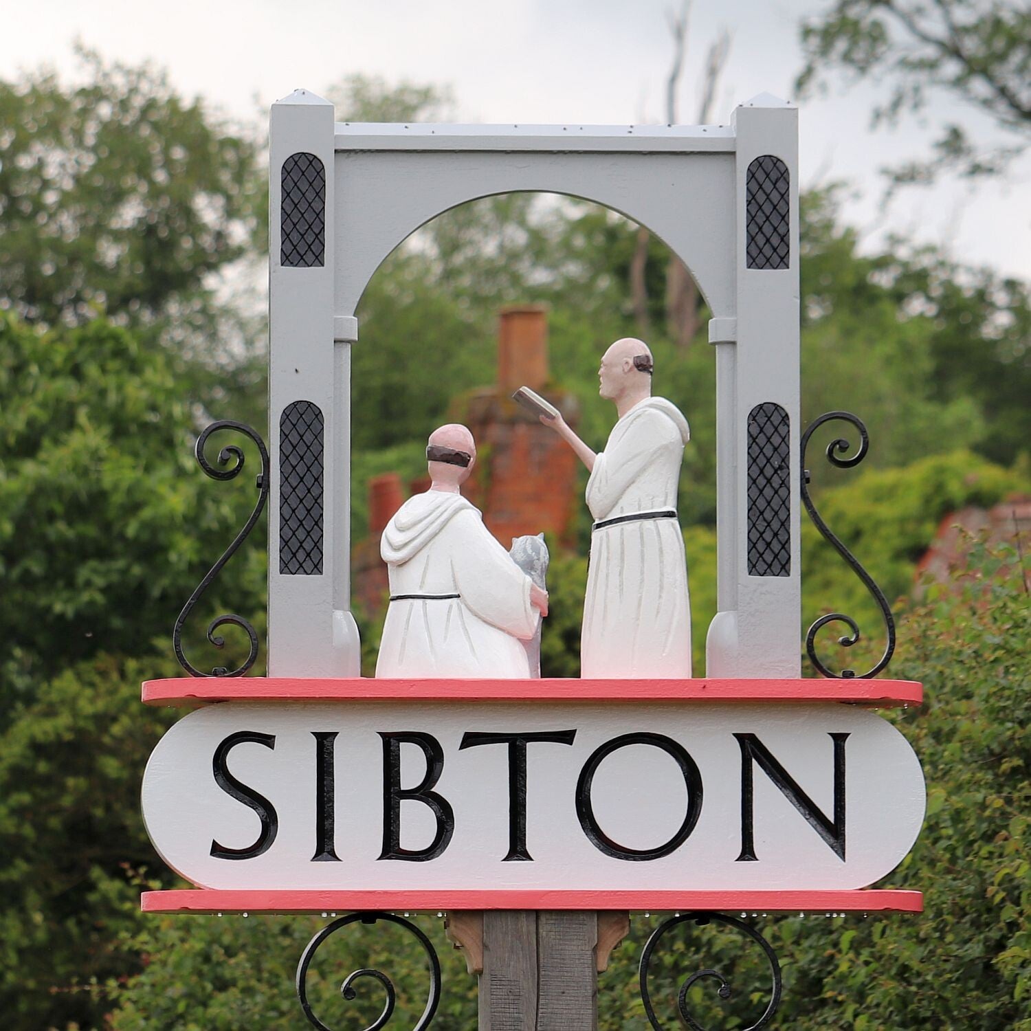 The sign depicts two Cistercian Monks outside Sibton Abbey complete with one holding a sheep which they kept and the other Monk probably reading from the bible. The original sign was carved by Harry Carter