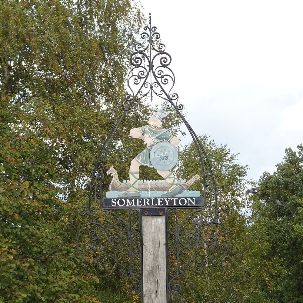 The sign was erected in 1949 to celebrate the Silver Wedding Anniversary of Lord and Lady Somerleyton. It is located on the village green.