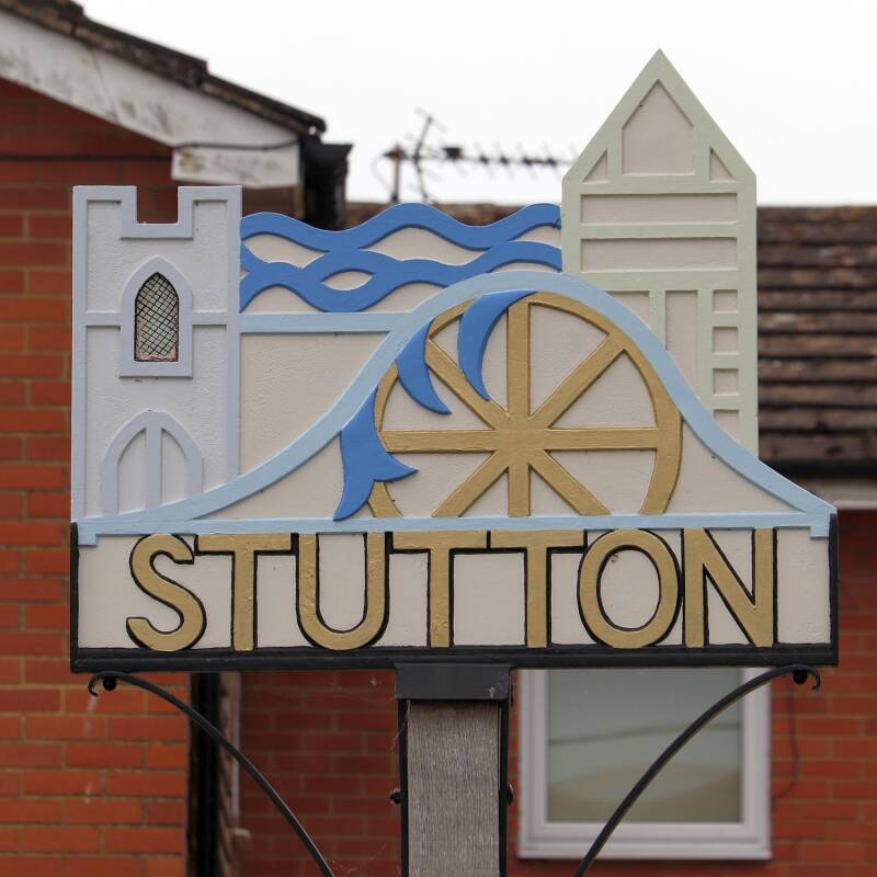 A plaque on the post records that the design, by Felicity Dean, is intended to show the village’s close association with the river and with Alton Water. The sign was presented to the village by the Stutton Community Centre committee and unveiled, at the side of the B1080 road opposite the Kings Head inn, in July 1981. The church is represented on the left and a water mill with its water wheel on the right. Is Alton Water represented at the top?