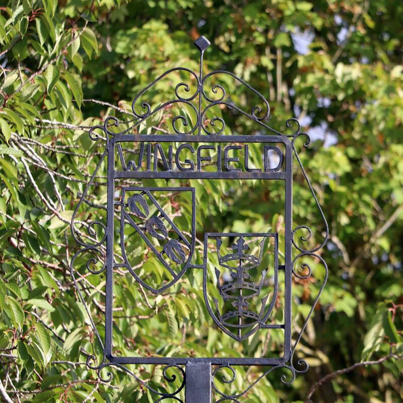 The sign is made of wrought iron and has the arms of the Wingfield family on the left showing three sets of angel wings and the three coronets of Bury Abbey on the right who owned most of the land before the Reformation.
